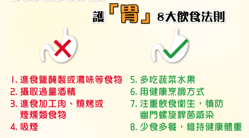 要預防胃癌,首先要慎防病從口入!周明欣指出,除了以上問題要注意外,吸煙、幽門螺旋桿菌感染等,同樣是增加胃癌風險的「元兇」,不容忽視。她提醒要注意8大飲食法則,不但有助預防胃癌,對護「胃」也有很大的幫助。