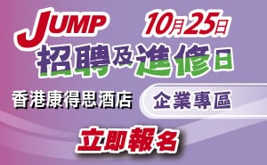 JUMP招聘及進修博覽2025 多間參展機構︱即場搵工面試 10月25日﹙六﹚旺角見! 立即報名 |