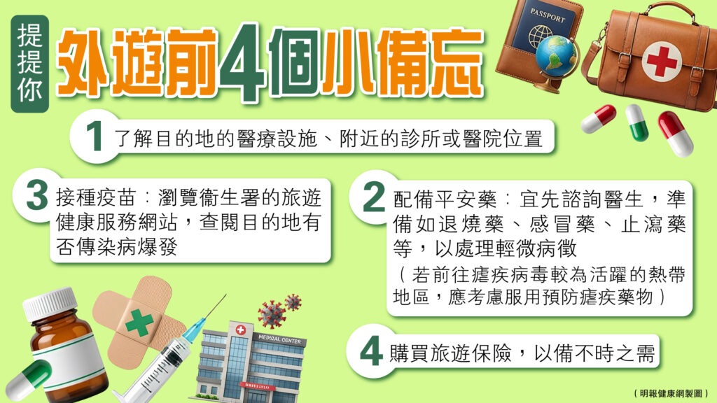 - 配備平安藥:出行前可先諮詢醫生,準備「平安藥」,如退燒藥、感冒藥、止瀉藥,以處理輕微病徵。如前往瘧疾病毒較為活躍的熱帶地區,應考慮服用預防瘧疾藥物,這些藥物可經醫生或旅行者診所取得。