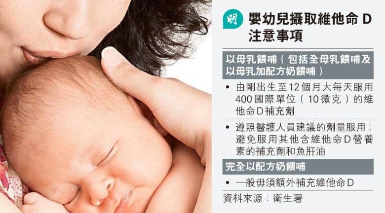 衛生署 根據專家工作小組建議,母乳餵哺(包括全母乳及混合餵哺)嬰兒應每日補充400國際單位維他命D。研究發現,全母乳餵哺嬰兒體內維他命D水平較低,而維他命D有助骨骼發展、腦部成長及提升免疫力,因此建議適量補充。