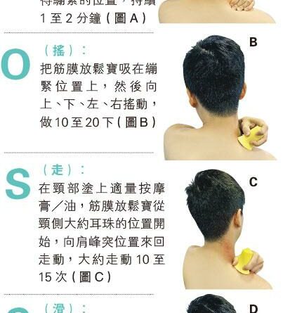 把筋膜放鬆寶吸在繃緊位置上,頭部側向另一邊,然後返回正中位置,重複做10至15次