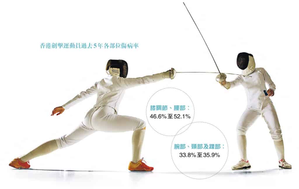 劍擊運動員的損傷流行率介乎於51.5%至92.8%,其中下肢為主要受傷部位(專業運動員56.1%,非專業運動員54%)。臨牀治療中,理大團隊接觸下肢與腰部的傷病最多,其中以膝關節為主,包括髕股關節疼痛綜合徵、髕腱炎及膕繩肌拉傷。在劍擊隊的長期服務中,我們分析運動員過去5年的年度體檢,其中膝關節、腰部傷病率最高(46.6%至52.1%),其次是腕部、頸部及踝部(33.8%至35.9%)。